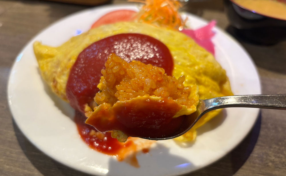 スプーンを入れると、しっかり焼かれたたまごがふわっとやわらかく割れ、中からはケチャップの香りが懐かしく立ち上ります。中のケチャップライスは酸味と甘みのバランスが良く、昔ながらの王道の味付けです。具材はシンプルですが、炒め油の香ばしさがほんのりと感じられ、一口ごとに「こういうオムライス、好きだったな」と思い出を揺さぶられるような優しい味が広がります。