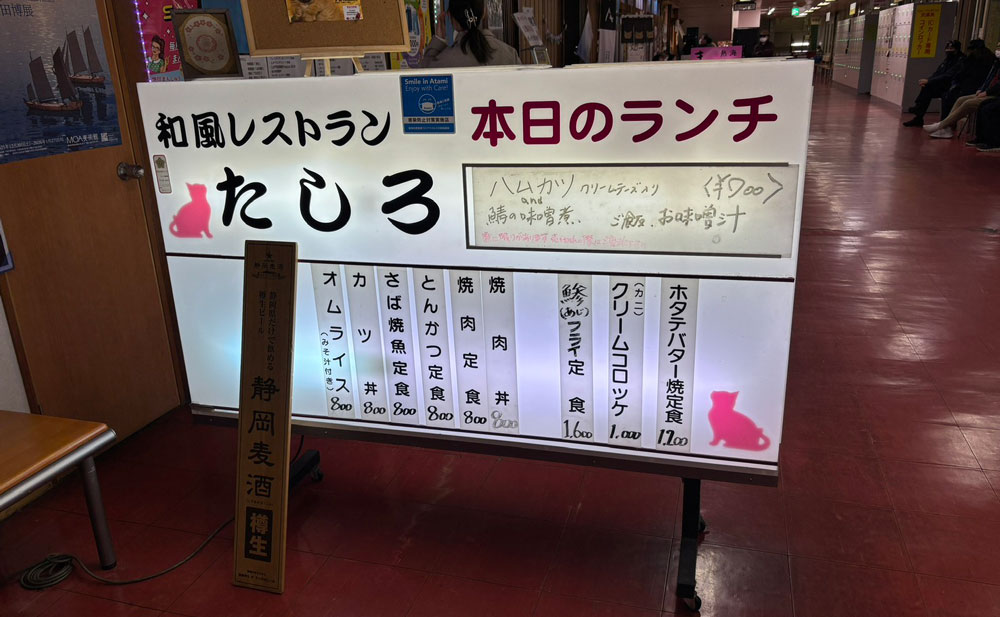 熱海駅を出てすぐの第一ビル地下に、昔ながらの雰囲気を残す定食屋「たしろ」があります。創業は昭和54年とされ、長年地元の方に愛されてきた食堂です。観光地の中心にありながら、肩肘張らずに入れる温かい空気が流れており、どこか懐かしい気持ちにさせてくれます。